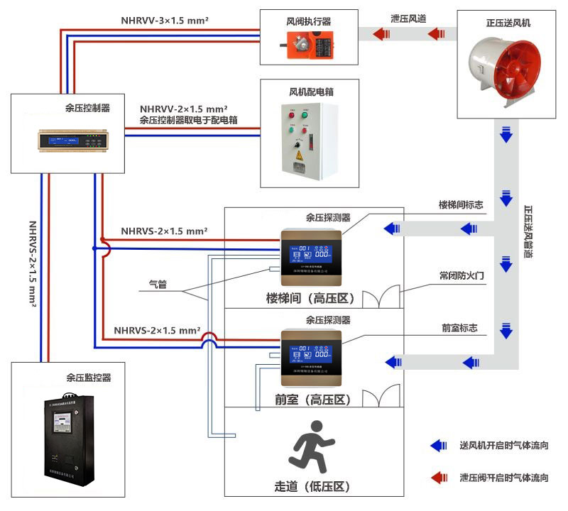發生火災時,余壓監控系統啟動,著火層及上下相鄰兩層風口開啟,圖中藍色箭頭表示正壓送風機開啟時空氣的流動方向,依據安全逃生原則,加壓送風應滿足防煙樓梯間壓力>前室壓力>走道壓力的壓力遞增分布。