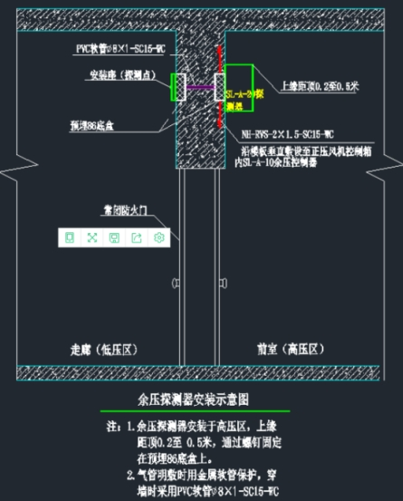余壓勘探器:也叫壓差操控器、余壓勘探器、壓力傳感器等,如圖,壁掛裝置樓梯間、前室內(nèi)防火門那一側(cè)(上圖右上部分),氣流安穩(wěn)避開風(fēng)口的地方,距頂20~50公分,直接固定在預(yù)埋86盒上壁掛裝置。