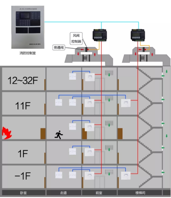 2、關(guān)于樓梯間,因為余壓監(jiān)控區(qū)域為一個空間且上下貫穿,余壓傳感器僅在整個修建樓梯間高度的1/3處安裝一個,余壓傳感器的勘探點一側(cè)設(shè)于樓梯間,另一側(cè)設(shè)于走道,余壓設(shè)定值為40-50pa,當(dāng)系統(tǒng)操控區(qū)域超壓時,系統(tǒng)聯(lián)動操控泄壓閥執(zhí)行器,依據(jù)實踐余壓值與設(shè)定值的差異調(diào)理泄壓閥,以確保前室正壓為設(shè)定值。