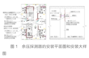 本項(xiàng)意圖1號(hào)住宅樓一共十六層,合用前室每層均設(shè)置余壓探測(cè)器,樓梯間在3層和11層各設(shè)一臺(tái)余壓探測(cè)器。規(guī)范層余壓探測(cè)器的裝置平面圖和裝置大樣圖(如圖1所示)。